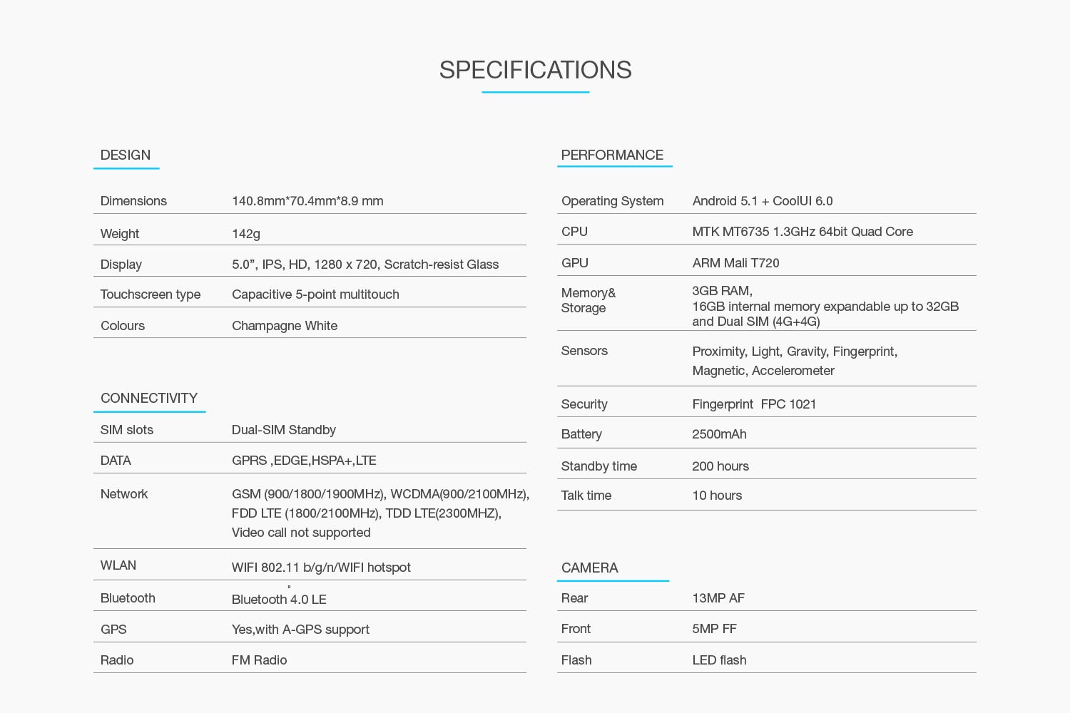 - Android v5.1 Lollipop operating system with 1.3GHz Cortex-A53 MT6735 Mediatek quad core processor, 3GB RAM, 16GB internal memory expandable up to 32GB and dual micro SIM (4G+4G)