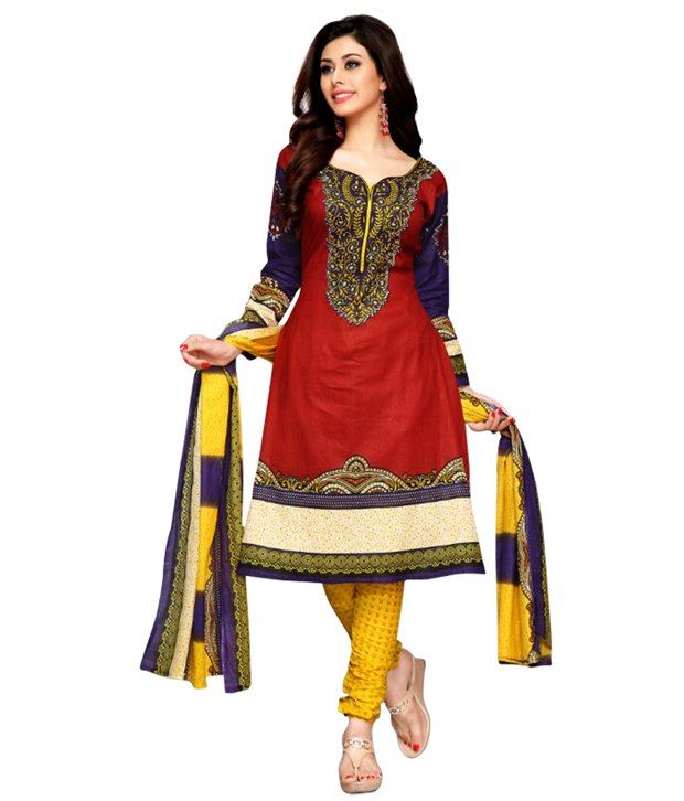 Drapes Red Cotton Unstitched Dress Material @ Snapdeal