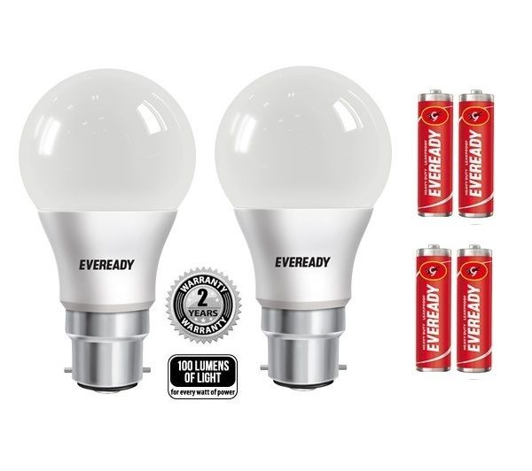 Warranty:24 month From Date of Sale or 30 month from MFG Date.Whichever is Lower Lumens:700 Highly Efficent -Lumens 100Lm/W Shape:Round Free: 4 Pc Eveready Ultima Alkaline AAA Battery Last 15 Years**No UV Constant Light in Fluctuation Energy Saving No Lead Mercury(**3.5hr Per Model:lb-b22-7w-230v Colour:White . Eveready Power (in Watts):7W Pack of:Pack of 2 Base Type:Pin B22 Power Factor – 0.9 Colour Temperature:Cool Day Light